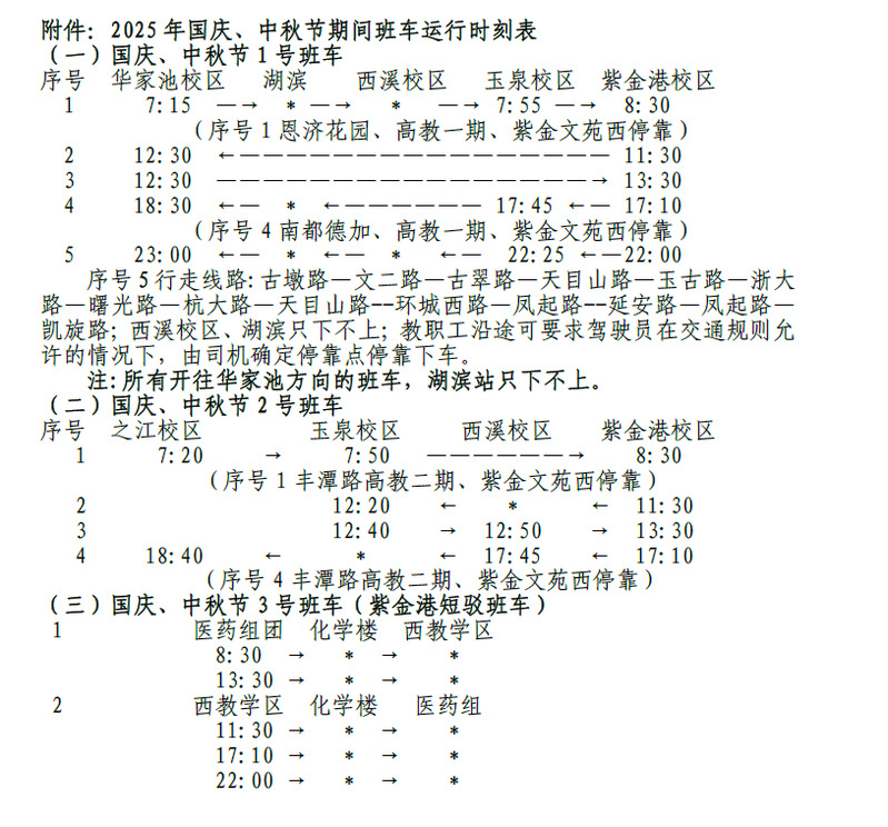 2. 10月1日-10月3日、10月6日,运行国庆、中秋节班车(详见附件);