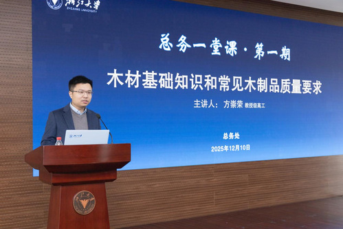 2025年12月10日,浙江大学总务处党支部指导、青工小组承办的“木材基础知识与常见木制品质量要求”专题讲座在紫金港校区校友楼紫金港厅举办,特邀我国木材科学领域专家方崇荣教授级高工主讲。